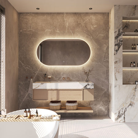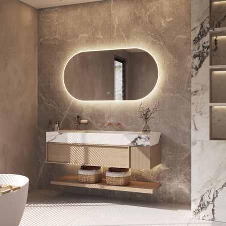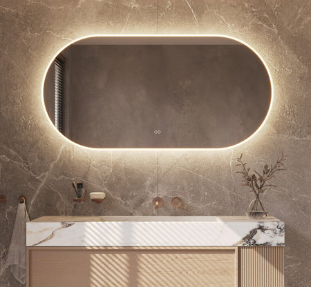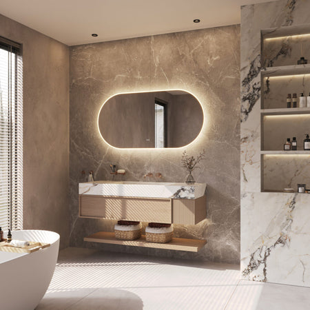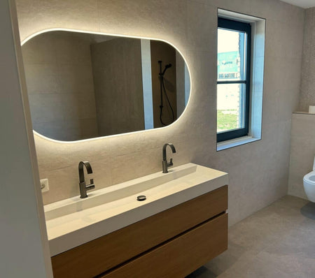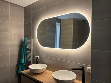 Deze trendy, ovale badkamerspiegel heeft een breedte van 140 cm en een hoogte van 70 cm. De fraaie verlichting is tegen de spiegelrand geplaatst en deze schijnt zowel rondom naar voren als rondom over de wand.