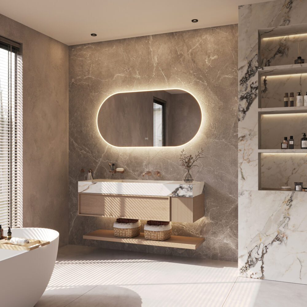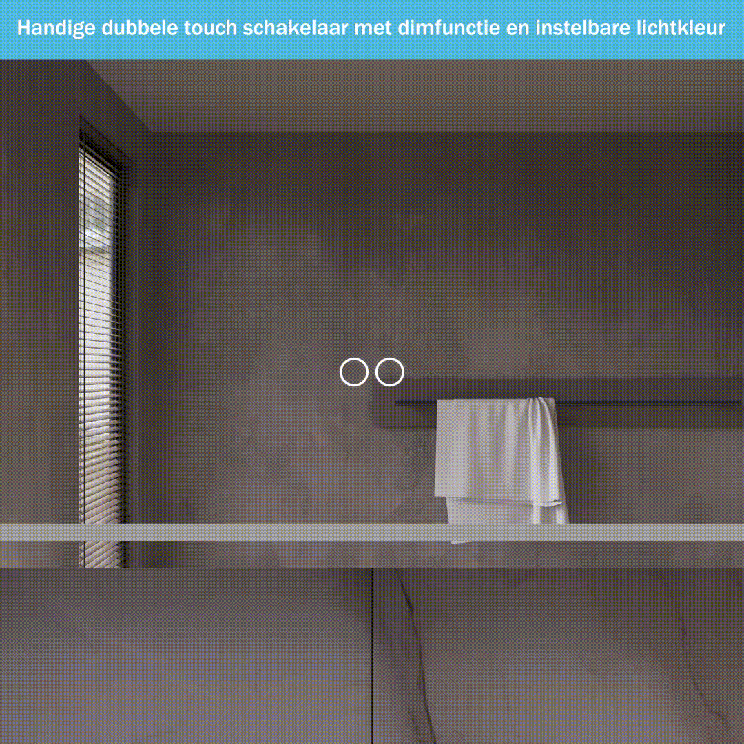 De hi-power verlichting is dimbaar middels een druk op de linker touch knop, zodat de gewenste lichtsterkte naar eigen wens kan worden ingesteld. Daarnaast kan met de rechter touch knop de gewenste lichtkleur traploos worden ingesteld tussen warm wit 2700K en 6400K, handig! De geïntegreerde spiegelverwarming zorgt ervoor dat de spiegel niet beslaat na bv het douchen.