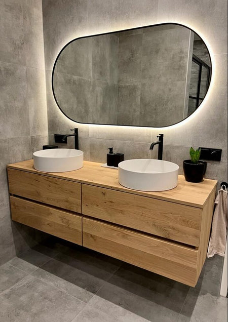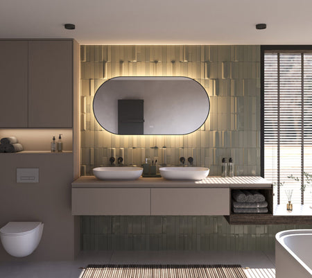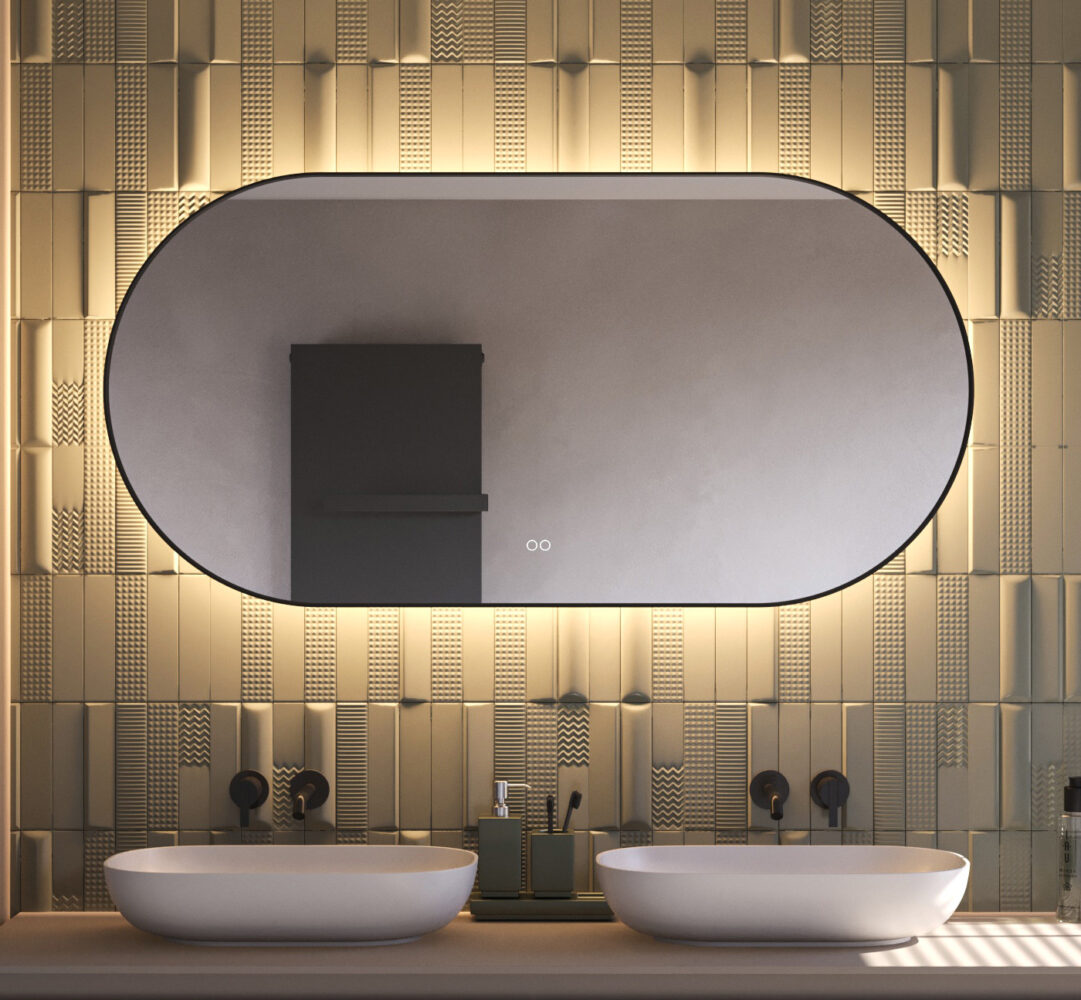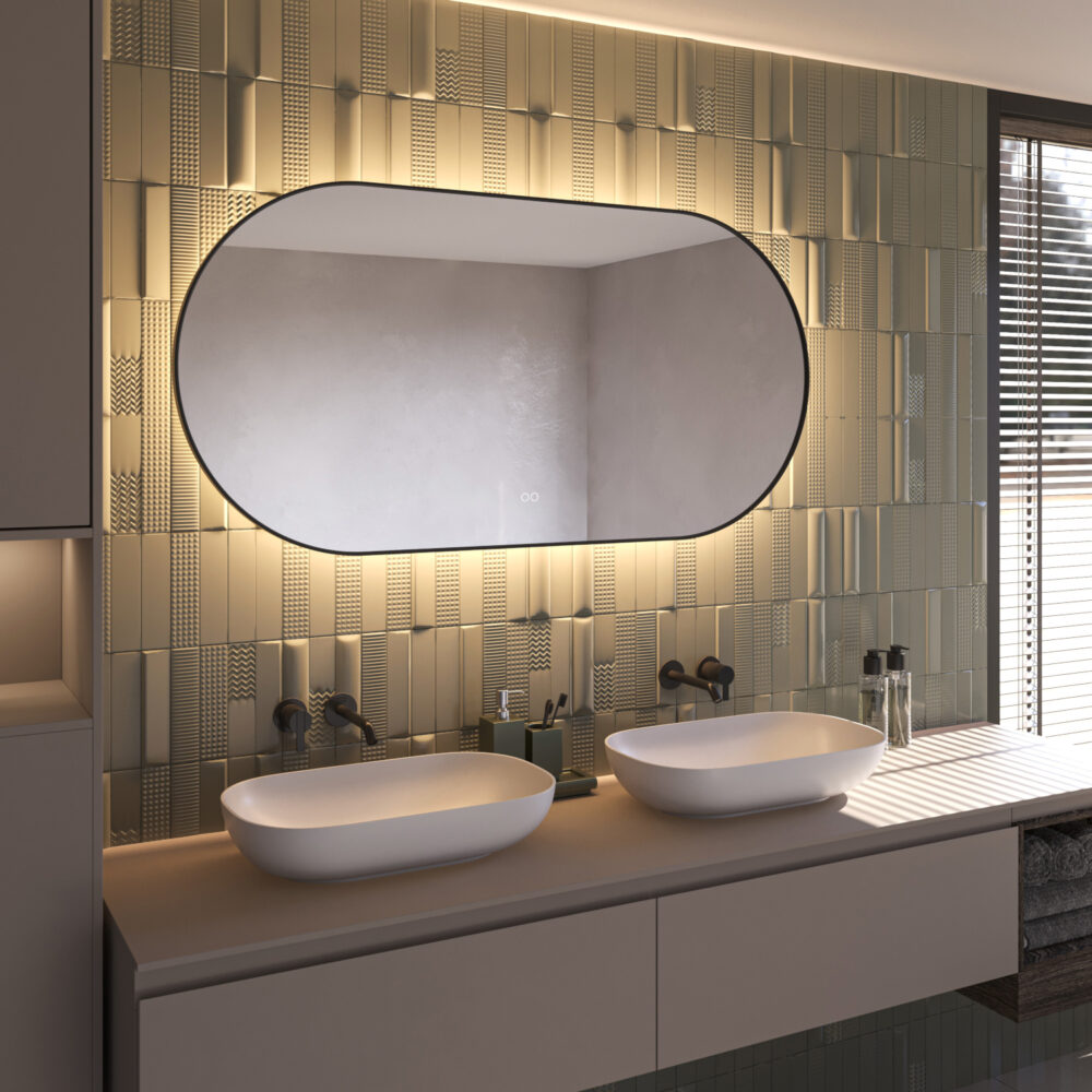 Deze trendy, ovale badkamerspiegel met zwart frame heeft een breedte van 140 cm en een hoogte van 70 cm. De verlichting is qua sterkte en lichtkleur instelbaar en schijnt rondom vanachter de spiegel over de wand en het wastafelmeubel.