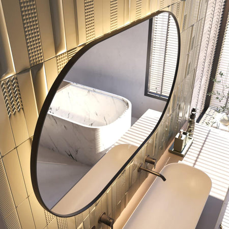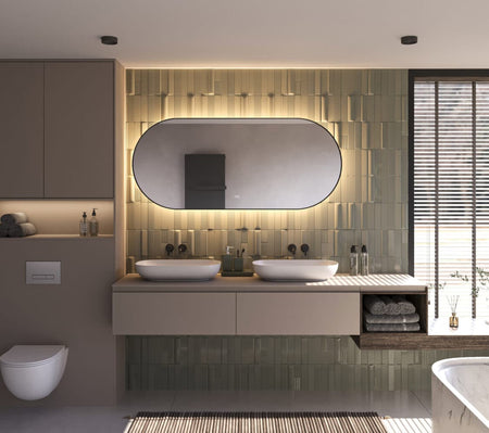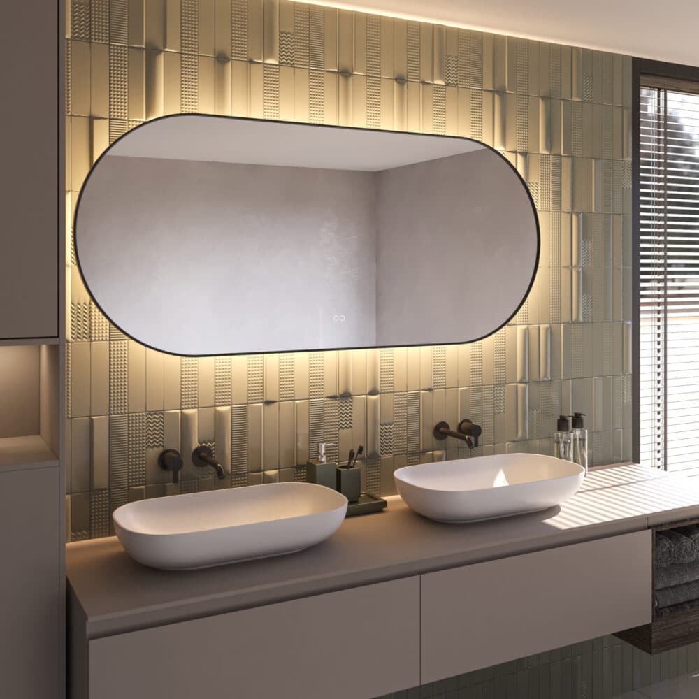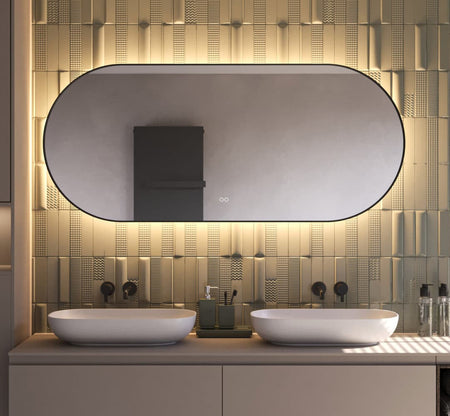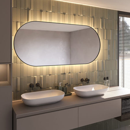 Deze 160 cm brede ovale badkamerspiegel is voorzien van een stijlvol en mooi afgewerkt mat zwart frame. De verlichting schijnt rondom vanachter de spiegel sfeervol over de wand.