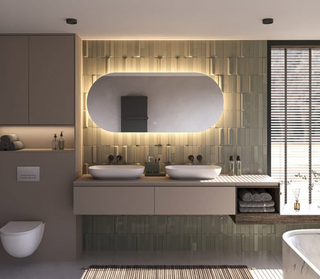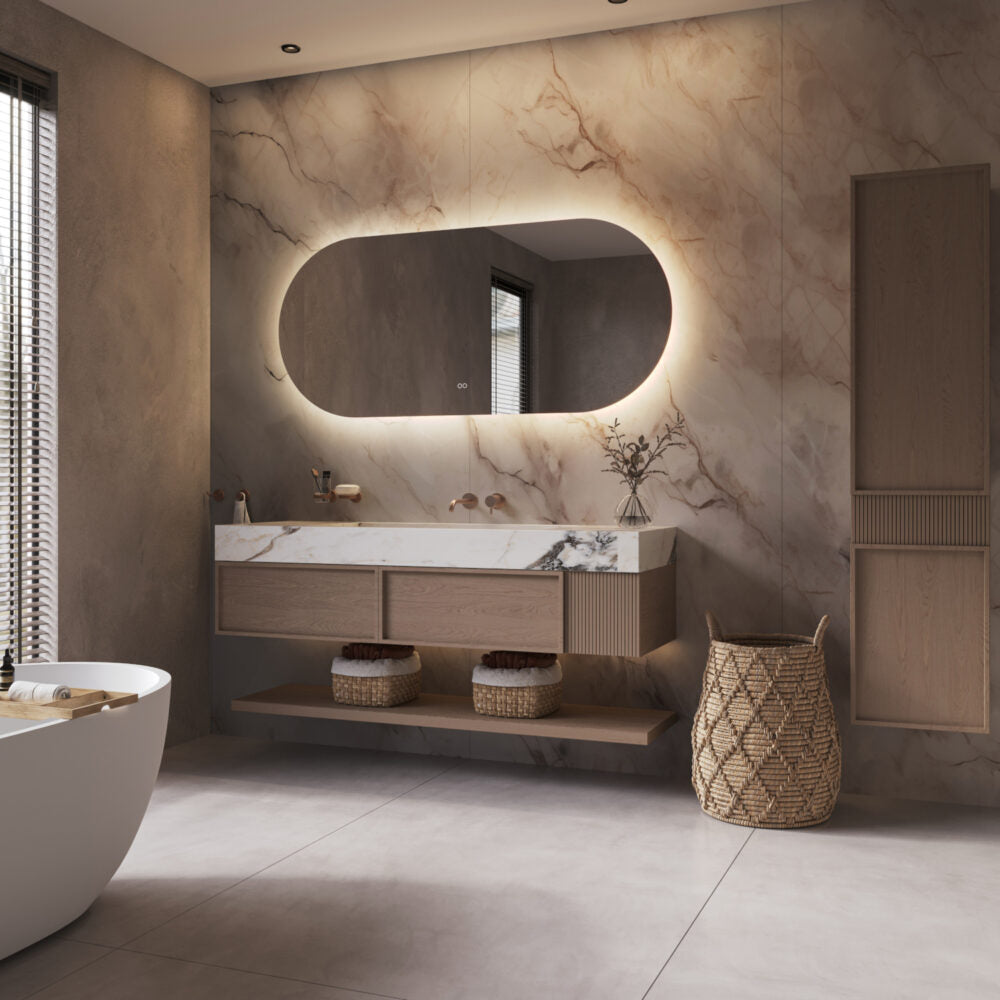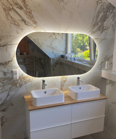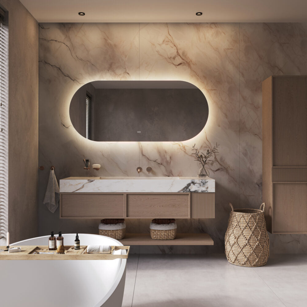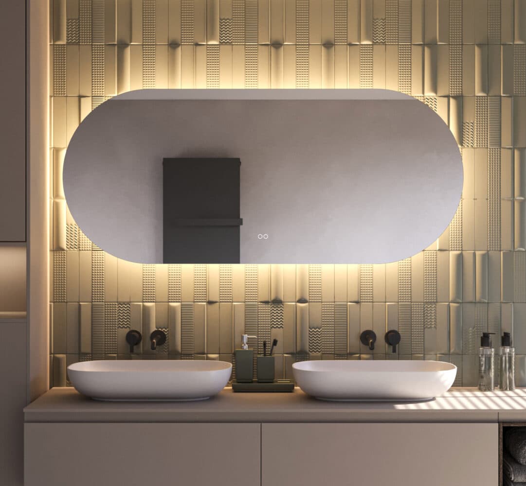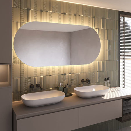 Deze stijlvolle, ovale badkamerspiegel heeft een breedte van 160 cm en een hoogte van 70 cm. De dimbare 24V verlichting schijnt vanachter de spiegel sfeervol over de wand. Naast verlichting is de spiegel voorzien van spiegelverwarming en een dubbele touch schakelaar voor het instellen van de juiste lichtkleur en de lichtsterkte. Zo creëer je in een handomdraai de juiste sfeer in de badkamer!