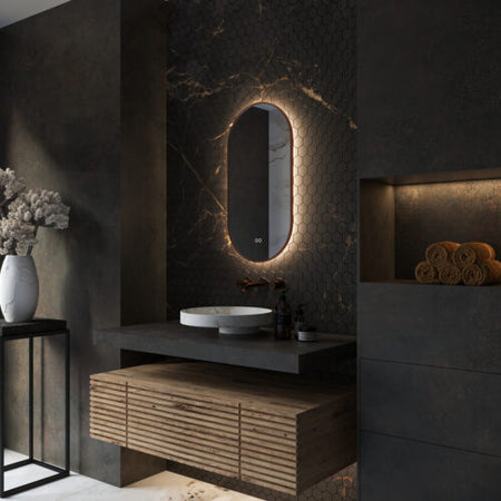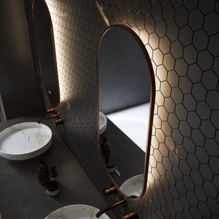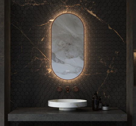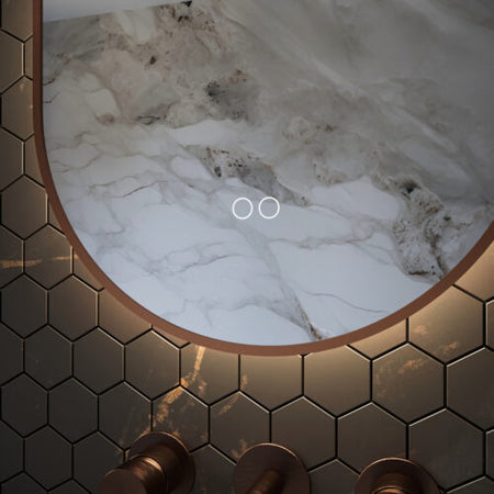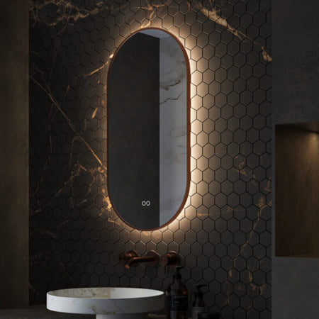 Deze trendy, ovale badkamerspiegel met koperen frame (PVD finish) heeft een breedte van 40 cm en een hoogte van 90 cm. De geïntegreerde LED verlichting met hoge lichtopbrengst schijnt rondom vanachter de spiegel sfeervol over de wand.