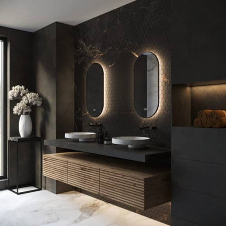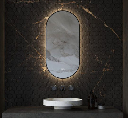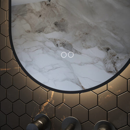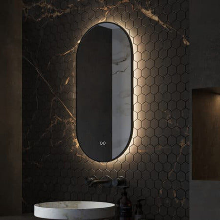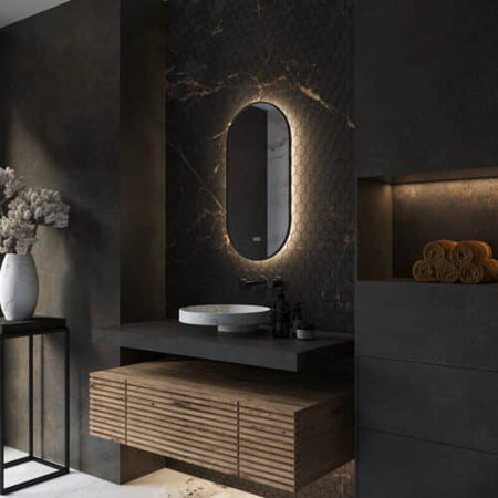 Deze trendy, ovale badkamerspiegel met gun metal frame (PVD finish) heeft een breedte van 40 cm en een hoogte van 90 cm. De geïntegreerde LED verlichting met hoge lichtopbrengst schijnt rondom vanachter de spiegel sfeervol over de wand.