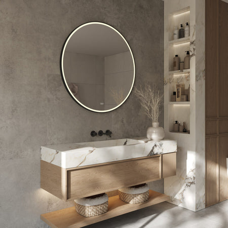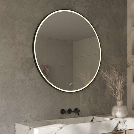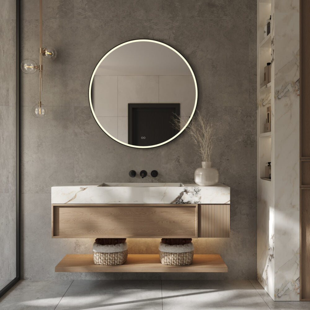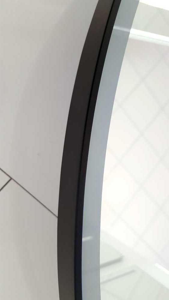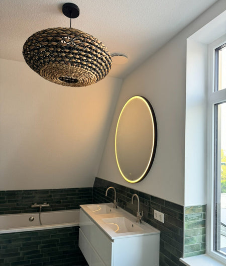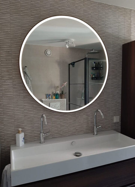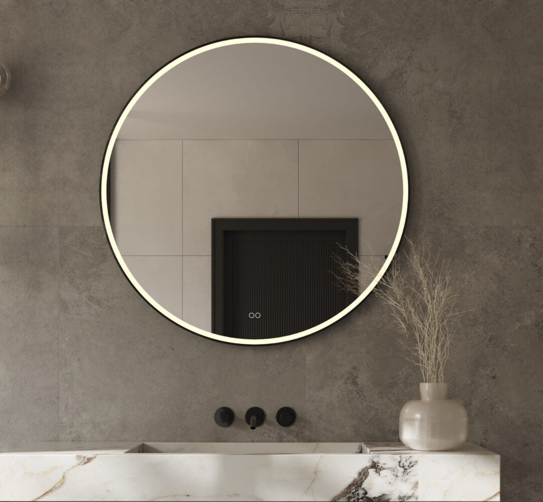 Prachtige ronde badkamerspiegel met een luxe afgewerkt, mat zwart frame.