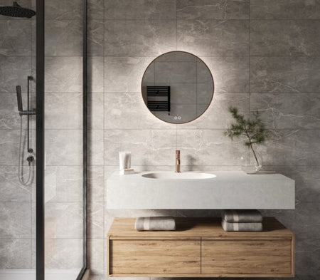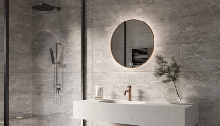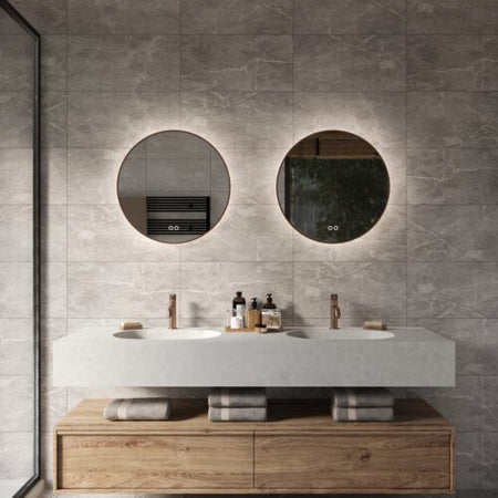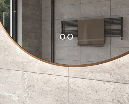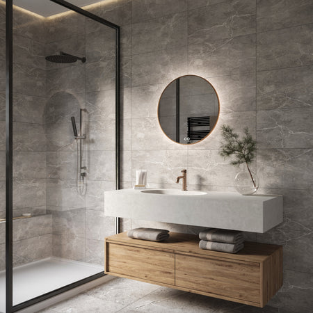 Deze luxe, ronde badkamer spiegel van 60 cm is uitgevoerd met een vol koperen rand. De dimbare indirecte verlichting schijnt fraai vanachter de spiegel over de wand.