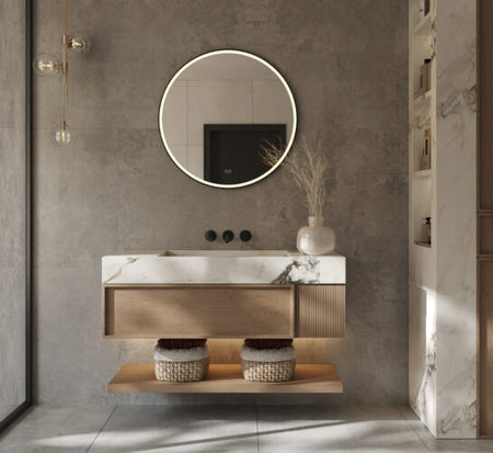De diameter is 80 cm en de spiegel beschikt over rondom geplaatste hi-power LED verlichting, spiegelverwarming en een dubbele touch schakelaar met dimfunctie en persoonlijke lichtkleur instelling voor de verlichting. De praktische verlichting schijnt door de 15 mm lichtbaan in het gezicht en geeft daardoor ruim voldoende licht bij bv het scheren of het make-uppen.