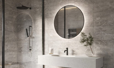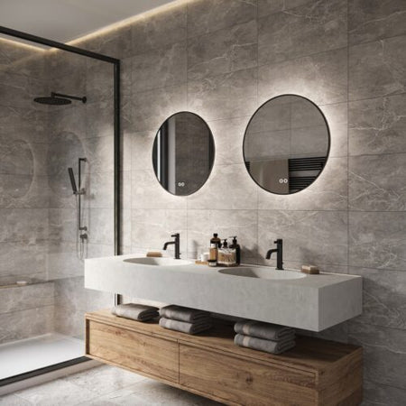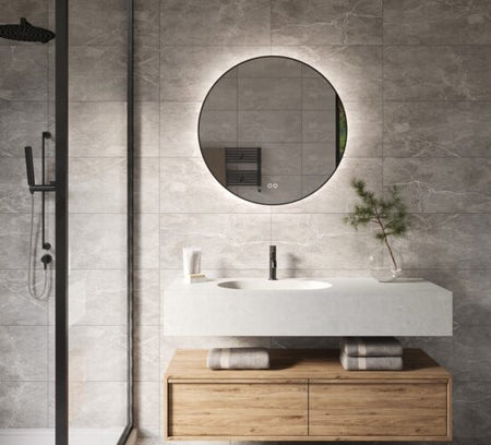 Deze moderne, ronde badkamer spiegel van 80 cm is uitgevoerd met een luxe gun metal rand. De dimbare indirecte verlichting schijnt fraai vanachter de spiegel over de wand.
