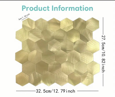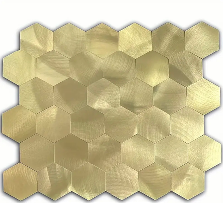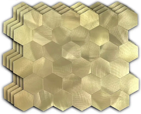 Zelfklevende mozaik geborsteld goud met aan de achterkant een sterke 3M kleeflaag. Ideaal om direct over oude tegels te plakken. Voor kalk(verf) muren of grovere oppervlakten adviseren wij extra montagekit toe te voegen.